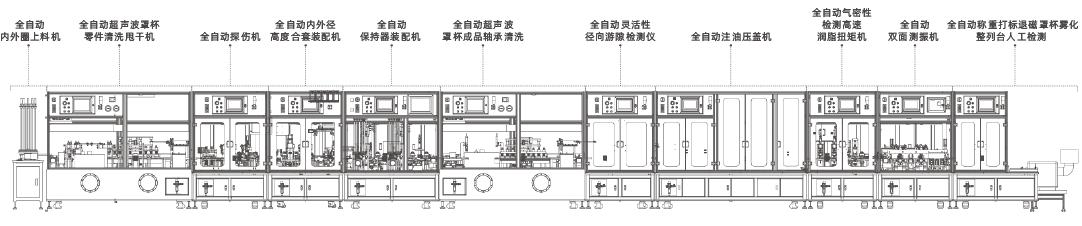 This equipment is mainly used for internal and external diameter height inspection, flaw detection, raceway sorting, roller filling, cleaning, clearance inspection, vibration measurement, torque inspection, atomization, SPC quality process monitoring of short cylindrical bearing.